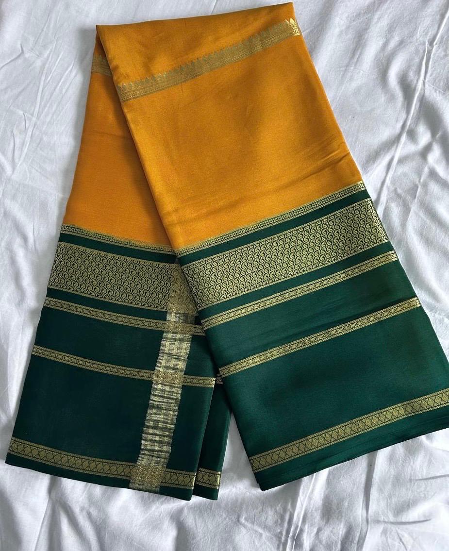 Mustard paired with a deep green in 2D concept, highlighted by elegant golden zari borders and intricate woven patterns