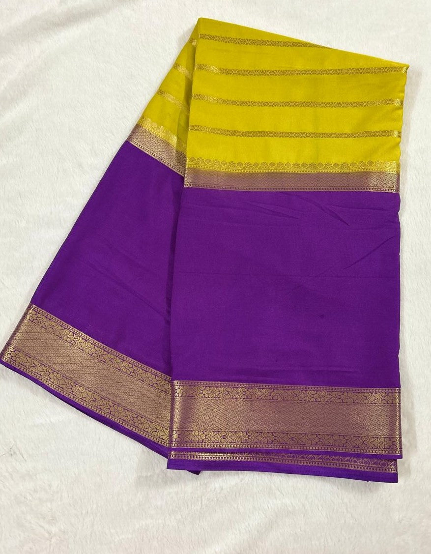 Semi Mysore silk saree with 2D concept, golden zari stripes on the body and woven golden border |