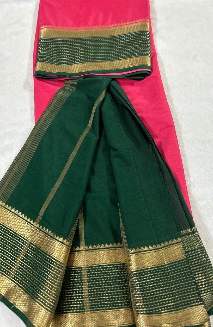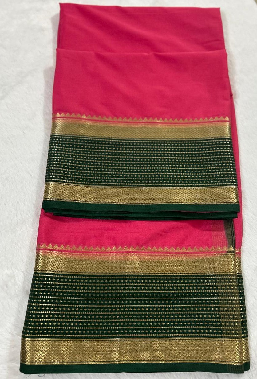 Vibrant pink body paired with a deep green border, highlighted by intricate golden zari weaving in geometric and dotted patterns for a rich traditional look |